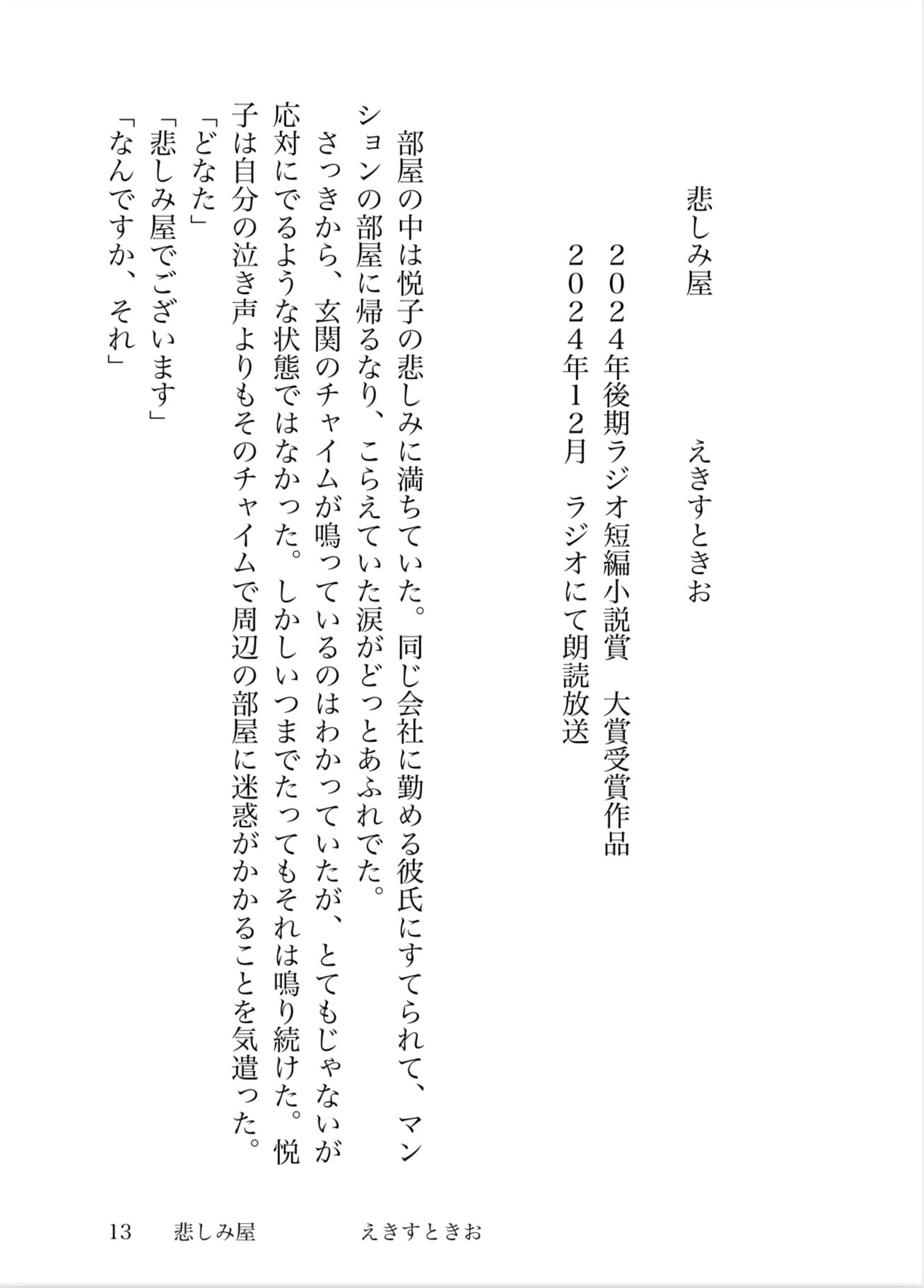 大賞受賞作:えきすときお「悲しみ屋」、準大賞受賞作:ゆず「ビタースノーチョコレート」、FMとまこまいテスト放送で朗読された、橘うみ「恐竜よ、さらば」など、全十六編を掲載。